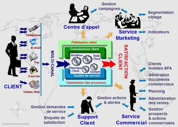 Le CRM ( Customer Relationship Management ), ou en français GRC ( Gestion de la Relation Client ) vise à proposer des solutions technologiques permettant de renforcer la communication entre l’entreprise et ses clients afin d’améliorer la relation avec la clientèle en automatisant les différentes composantes de la relation client :
