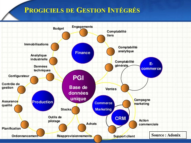 Les ERP ( Enterprise Resource Planning ), aussi appelés Progiciels de Gestion Intégrés (PGI), sont des applications dont le but est de coordonner l’ensemble des activités d’une entreprise (activités dites verticales telles que la production, l’approvisionnement ou bien horizontales comme le marketing, les forces de vente, la gestion des ressources humaines, etc.) autour d’un même système d’information.